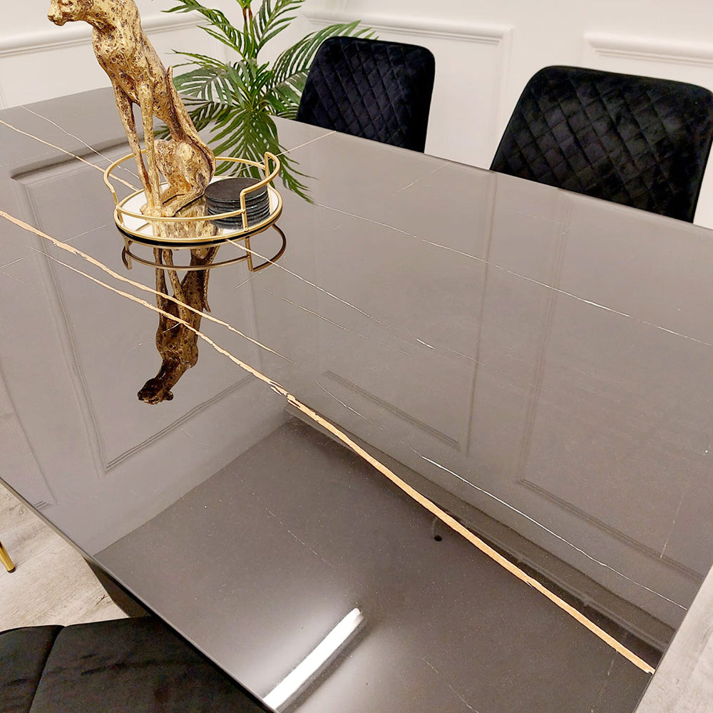 The Apollo 1.6m Black Dining Table brings a sleek, dramatic look into the dining room. Its black sintered stone top features a subtle mustard-gold grain, finished with a robust black crossover pedestal base for a clean modern statement.