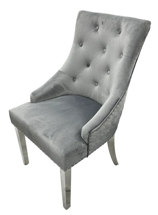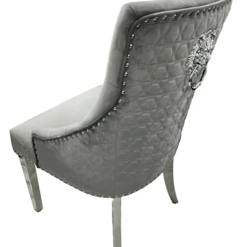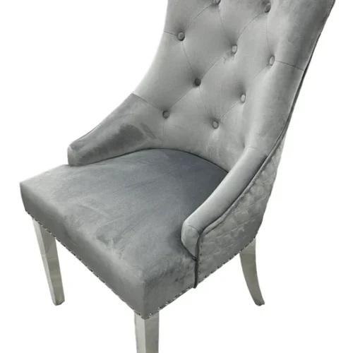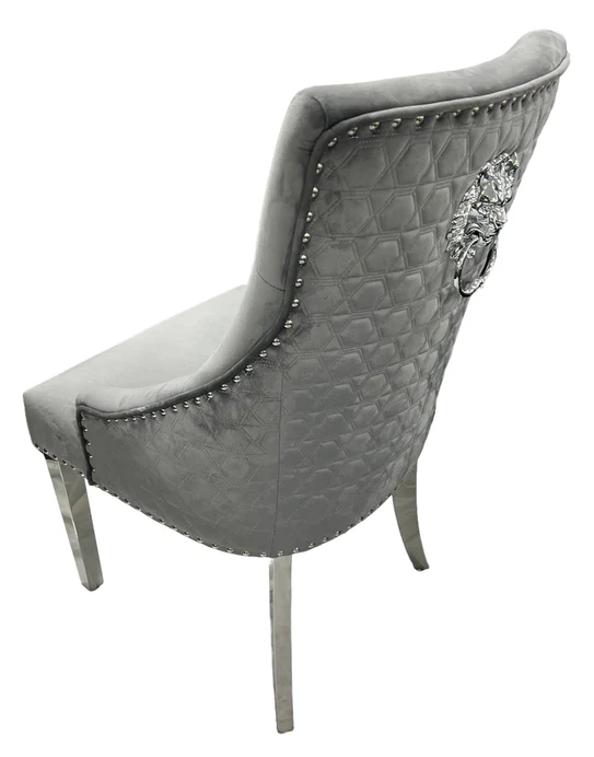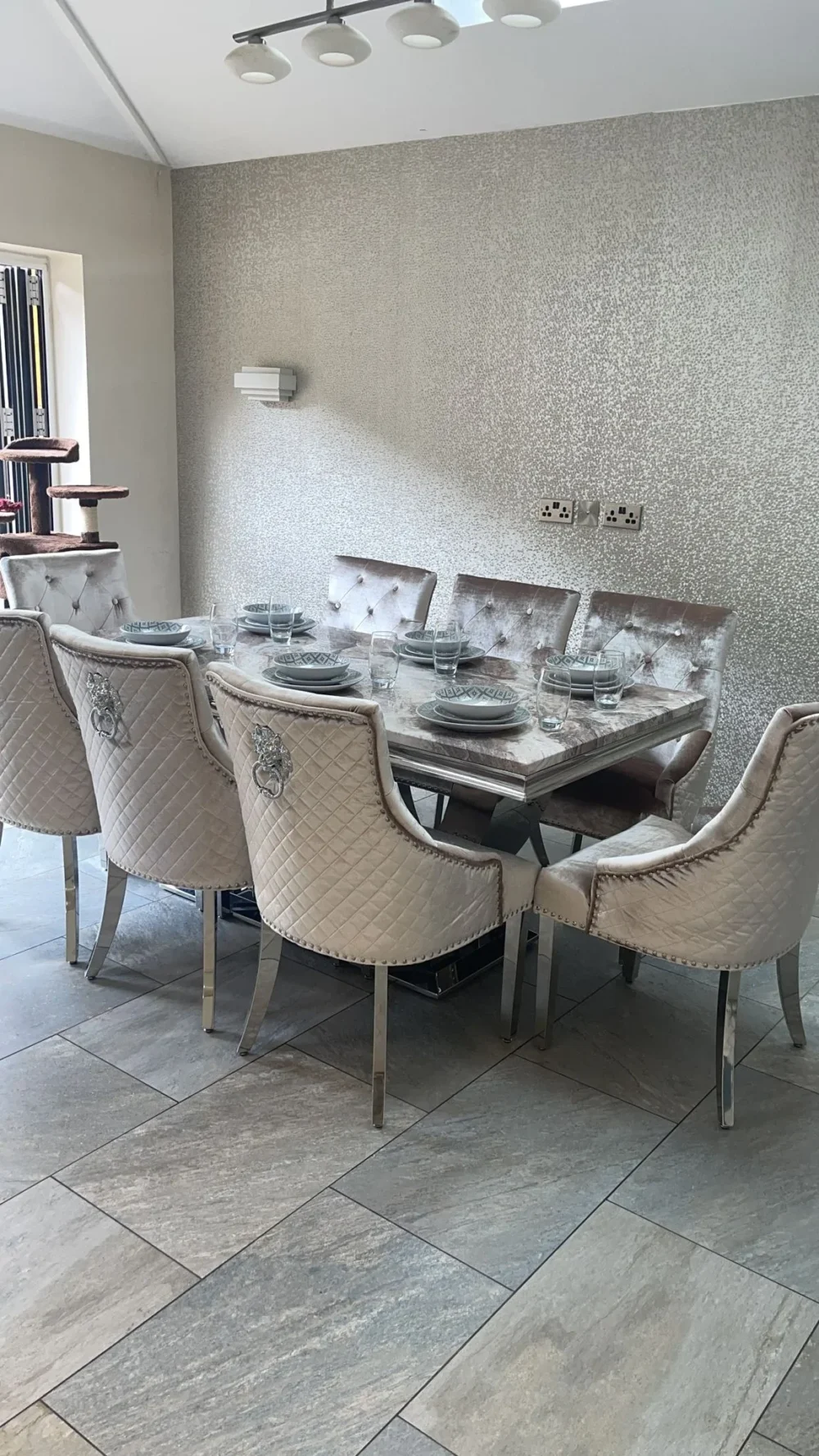Arial Marble & Chrome Dining Table + Lion Knocker Velvet Chairs