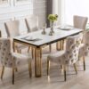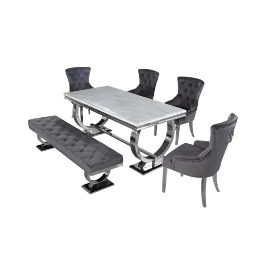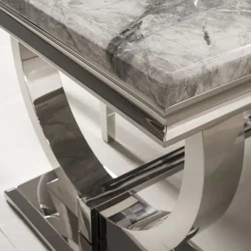 Bring luxury into your dining space with the Arriana Dining Table – a statement piece that effortlessly commands attention. Featuring a stunning light grey marble or glass top paired with an eye-catching polished stainless steel base, this table is designed to impress.