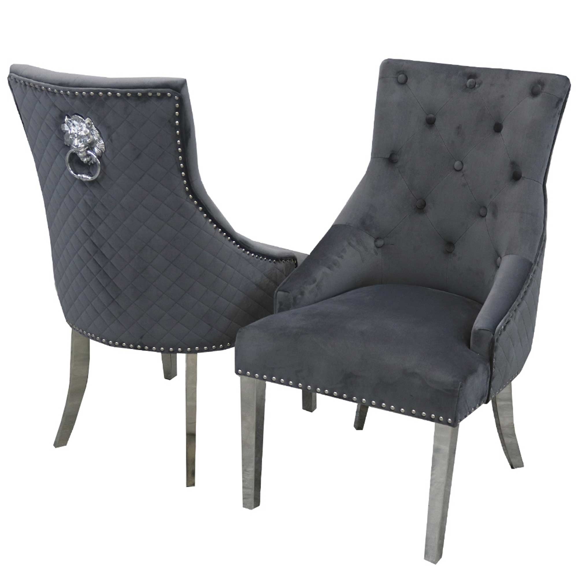 Bentley Dark Grey Velvet Dining Chair with Chrome Lion Knocker & Quilted Back
