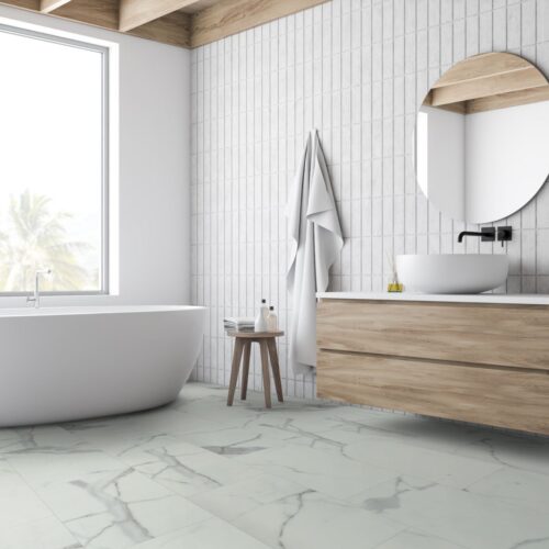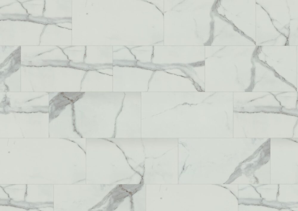 This stunning rigid core vinyl offers a traditional tile pattern. Carrara White Marble Matt features a robust “Core” of limestone and stabilisers, enhancing durability, stability and dent resistance.