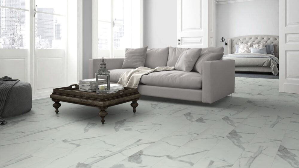 The Carrara White Marble Matt showcases a refined white marble design with subtle grey veining, offering a modern touch to any room. Its smooth, matte embossed surface enhances the authenticity of the floor.