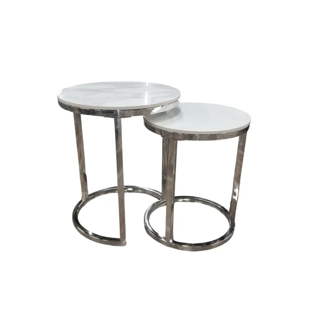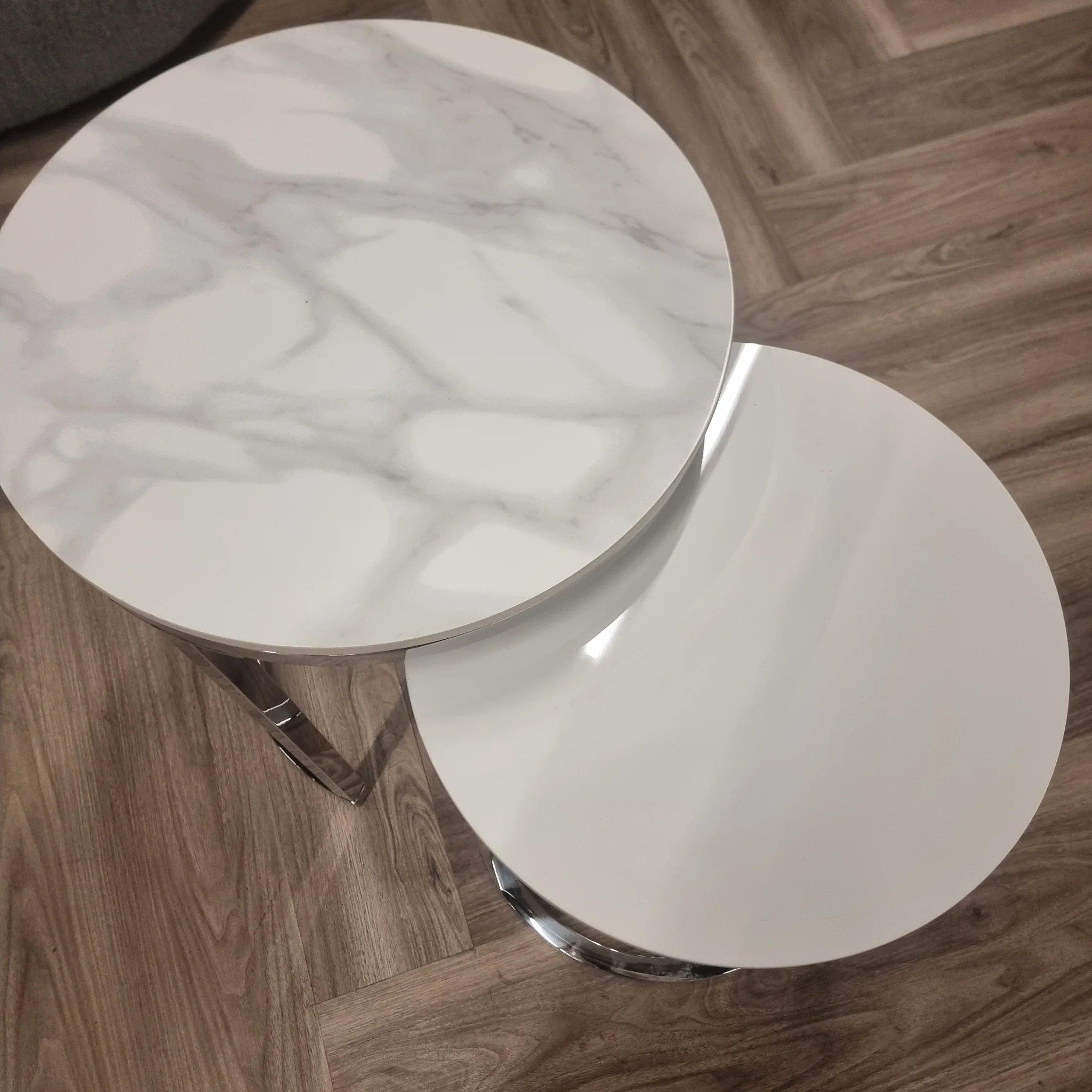 Elevate your space with this elegant 2-piece nesting table set, designed with sleek Polar White sintered stone tops and contemporary round Silver Chrome frames. A perfect blend of style and function, ideal for modern interiors.