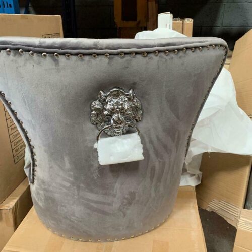 - Features a lion knockerback design, chrome polished steel legs, button detailing, and studded accents.