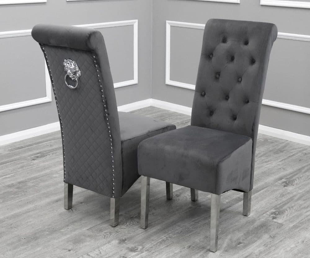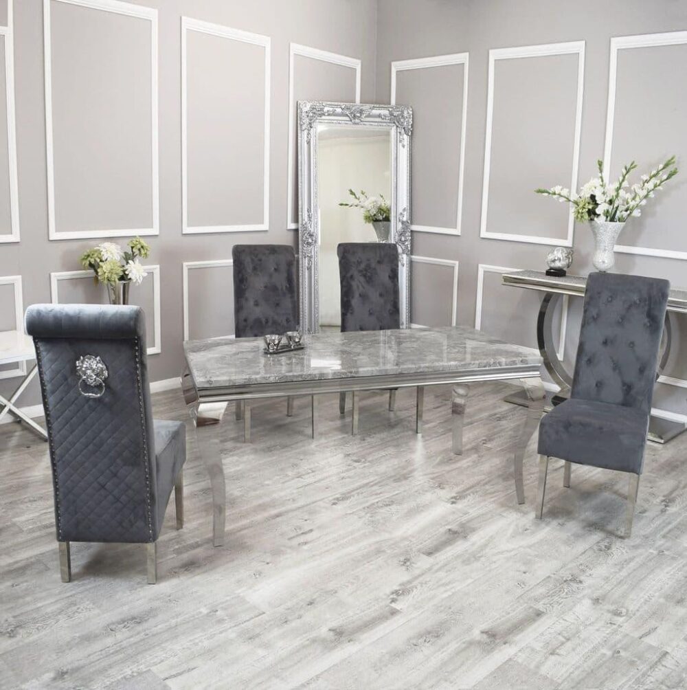 Louis 120cm Grey Marble Dining Table + Lucy Grey Lion Slim Knocker Plush Velvet Chairs