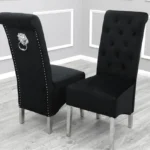- Chairs: The Lucy Lion Knockerback dining chairs feature a slim design, upholstered in luxurious black velvet. These high-back chairs are highlighted with quilted backs, chrome lionhead knockers, and studded accents for a regal, sophisticated look.