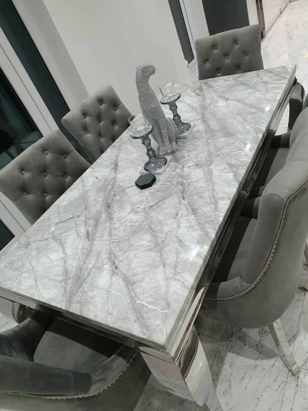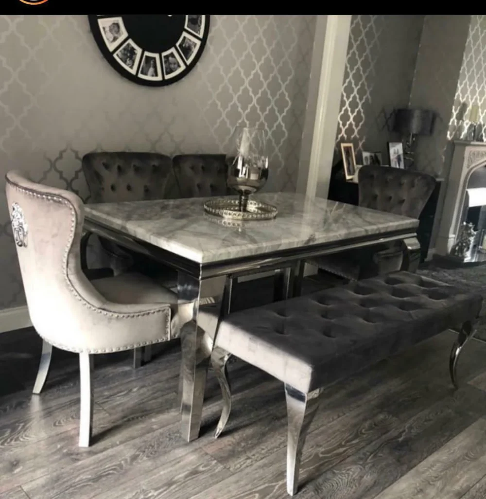 Louis Grey Marble 150CM Dining Table + Grey Lion Chairs, Bench Option