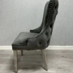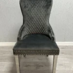 - Chairs: The Lucy Slim Lion Knockerback Chairs are crafted from luxurious grey plush velvet. They feature a quilted design, studded detailing, and a chrome lionhead knocker, offering comfort and contemporary elegance.