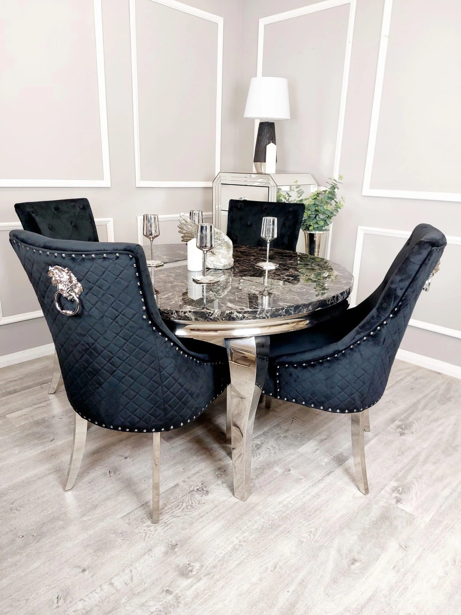 Louis Black Marble 130cm Round Dining Table + Black Lion Knocker Plush Velvet Chairs