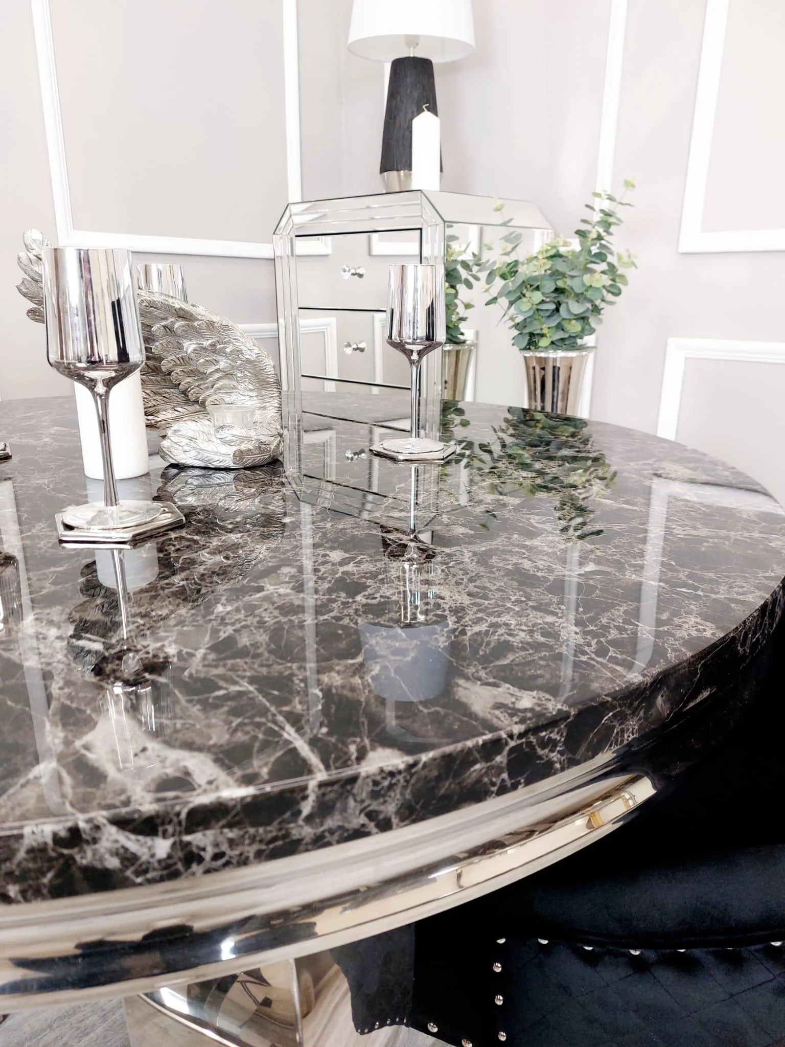 Introduce elegance and contemporary flair to your dining space with the Louis Marble Round Dining Range. This stunning collection features a sleek black marble top paired with stainless steel French Louis legs, creating a sophisticated and modern dining experience.