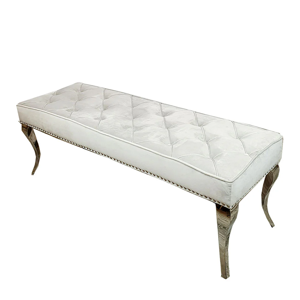 This stunning bench features chrome French-style legs paired with a luxurious velvet buttoned seat, offering both comfort and sophistication. Its timeless design makes it a versatile piece for any home.