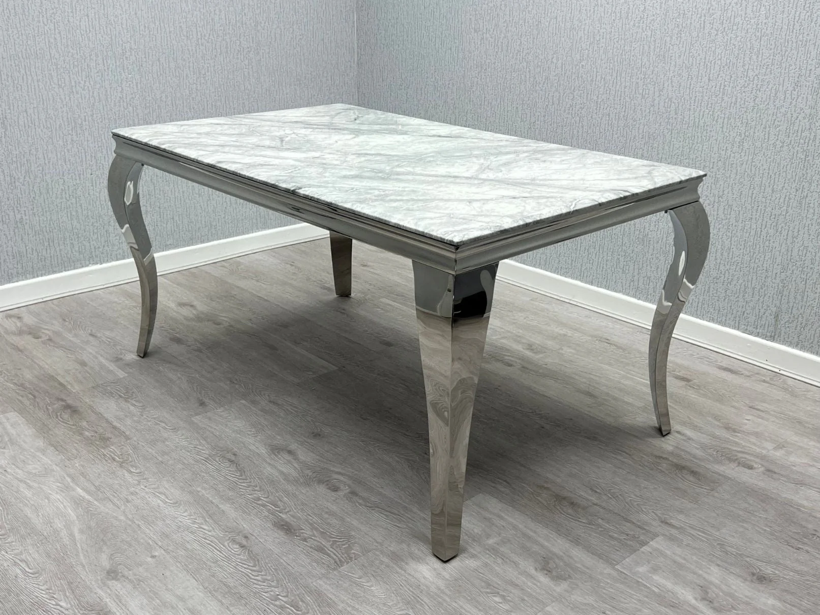 - Constructed with a solid metal chrome frame and stylish curved legs, the table showcases a light grey marble top, offering both sophistication and durability.