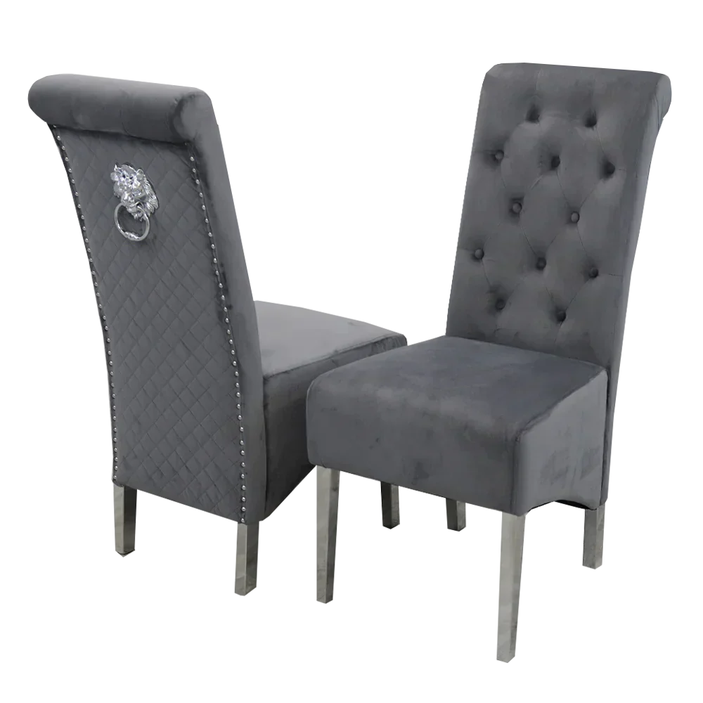 Louis Marble & Chrome Dining Table With Lucy Slim Quilted Lion Knocker Velvet Chairs & 140cm Bench
