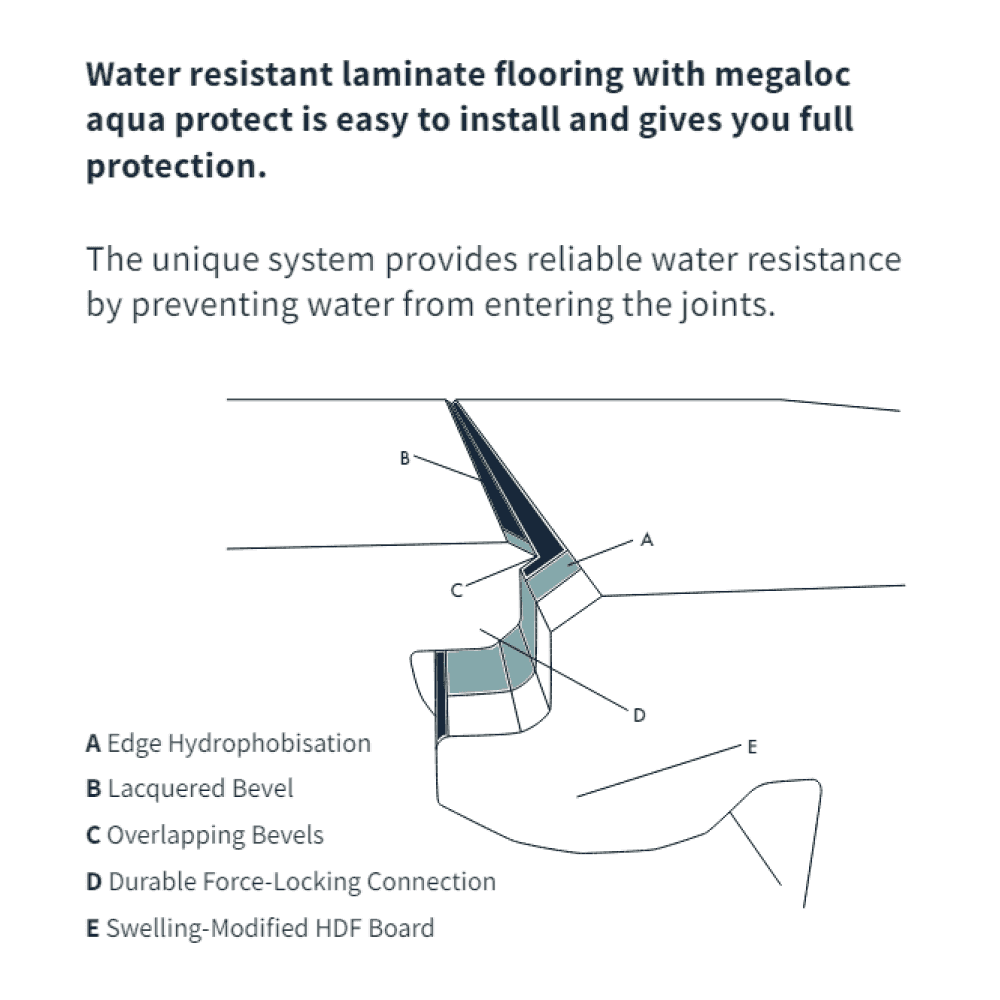 The Aqua Pro range features enhanced water resistance. When all edges and joints are properly sealed, this flooring can withstand surface water for up to 48 hours. However, spills should still be wiped up promptly.